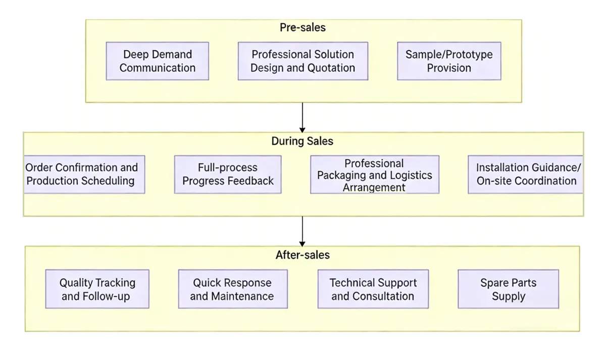 Selepas pengesahan pesanan, YeHaoXuan akan memulakan jadual pengeluaran khusus, membolehkan anda menjejaki kemajuan dalam masa nyata; selepas pengeluaran, kami menggunakan pembungkusan profesional dan logistik yang boleh dipercayai, dan menyediakan panduan pemasangan dan sokongan di tapak yang diperlukan untuk memastikan penghantaran produk lancar.